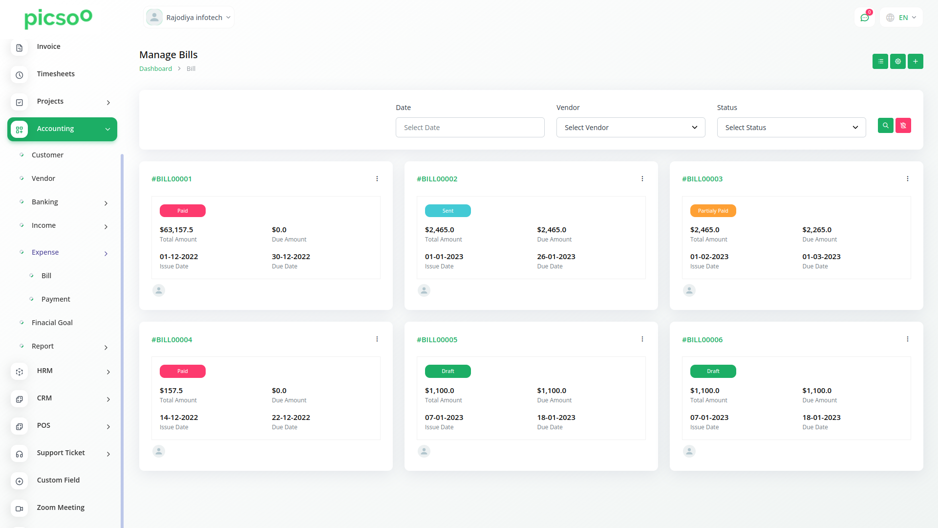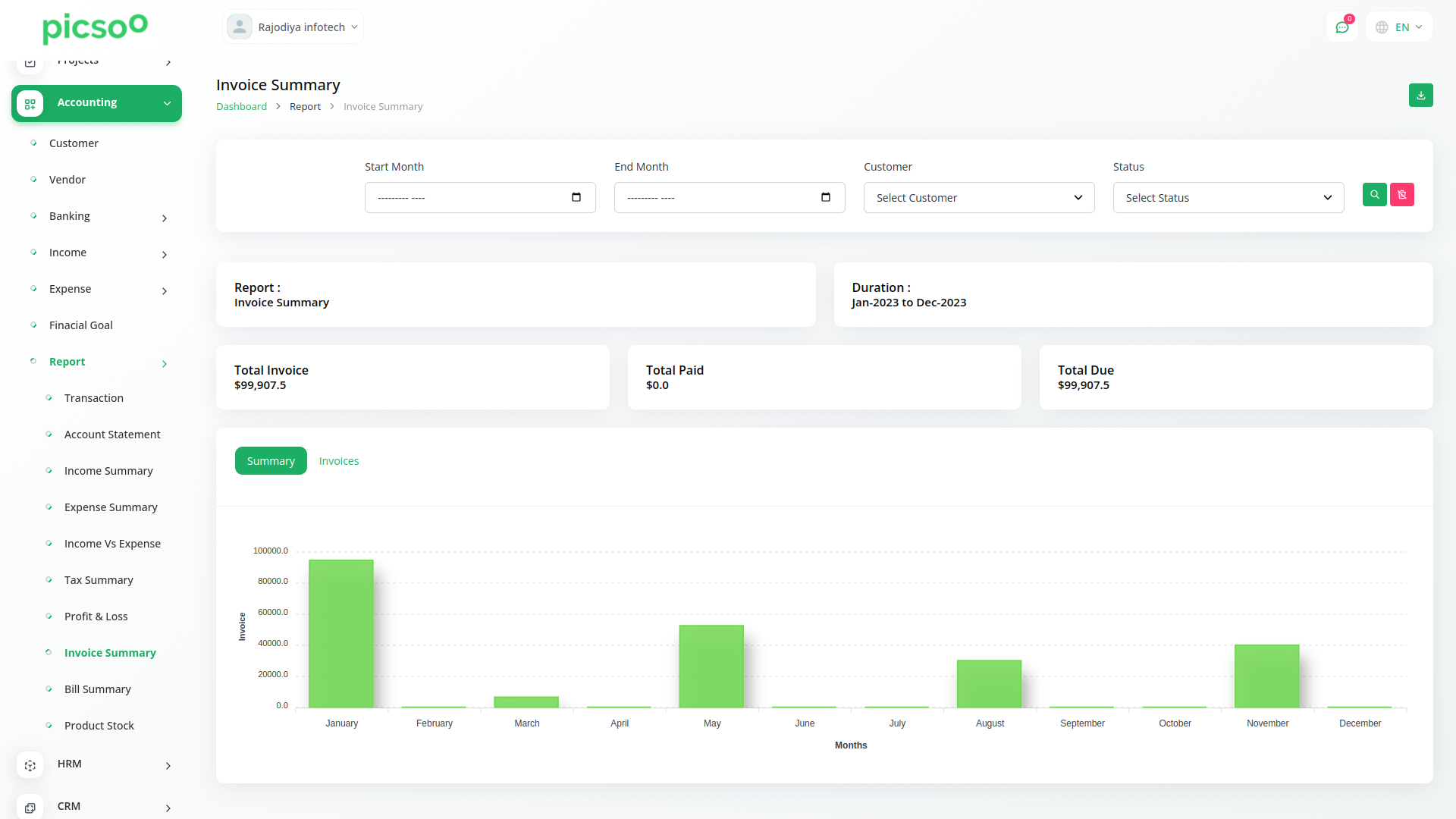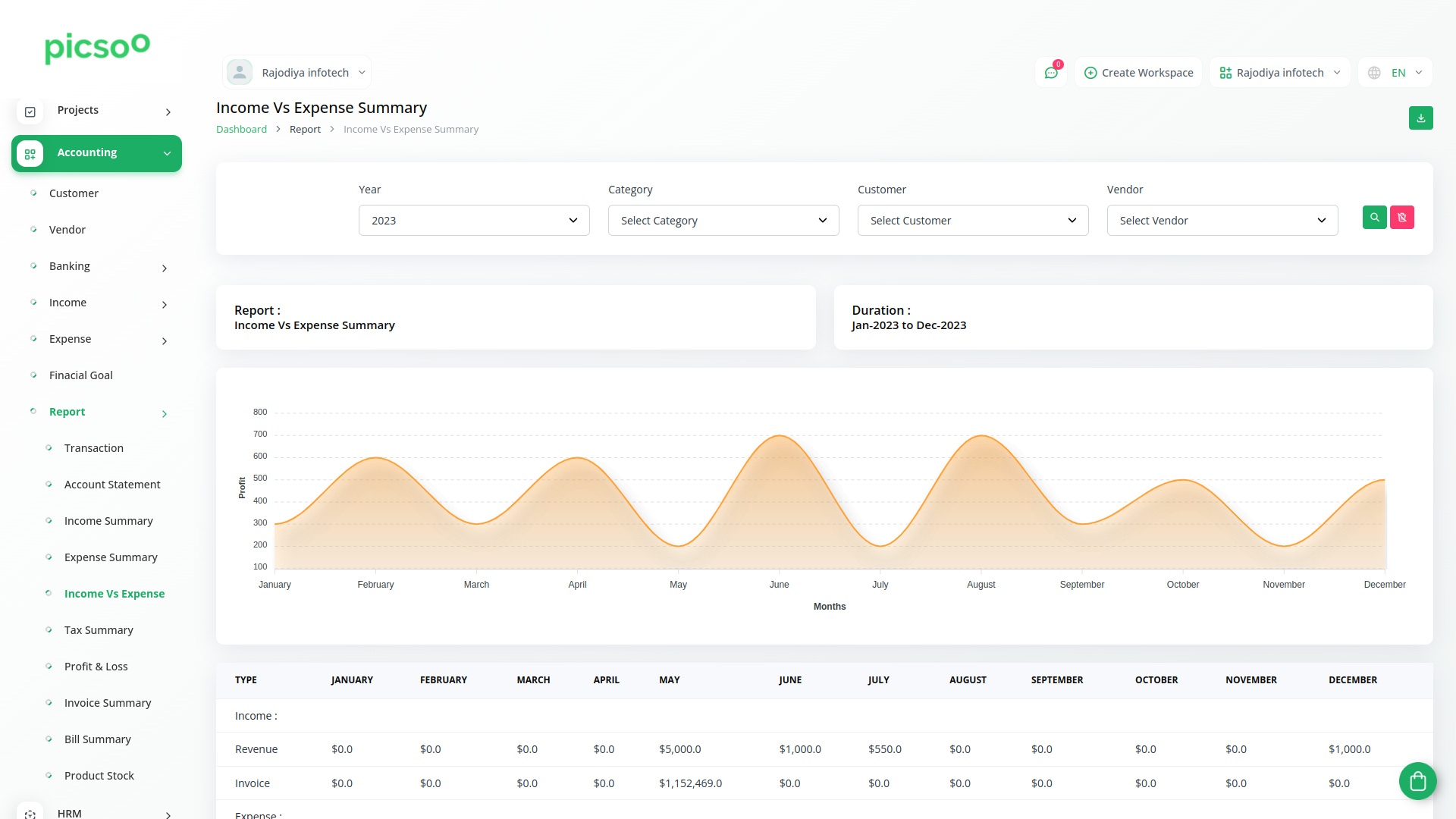Obtenez un rapport sur les transactions avec une option de filtrage facile. Téléchargez les relevés de compte requis au format PDF, CSV ou Excel. Vous obtenez des rapports dûment préparés sur les revenus individuels, les dépenses, les taxes, les factures et le résumé des factures. Filtrez-les en fonction du compte, de la catégorie et des clients. De plus, l'affichage graphique des revenus et des dépenses ainsi que le calcul détaillé des profits et des pertes vous aideront à prendre des décisions éclairées. Filtrez le résumé des taxes et le tableau des revenus et des dépenses en fonction des exercices financiers.