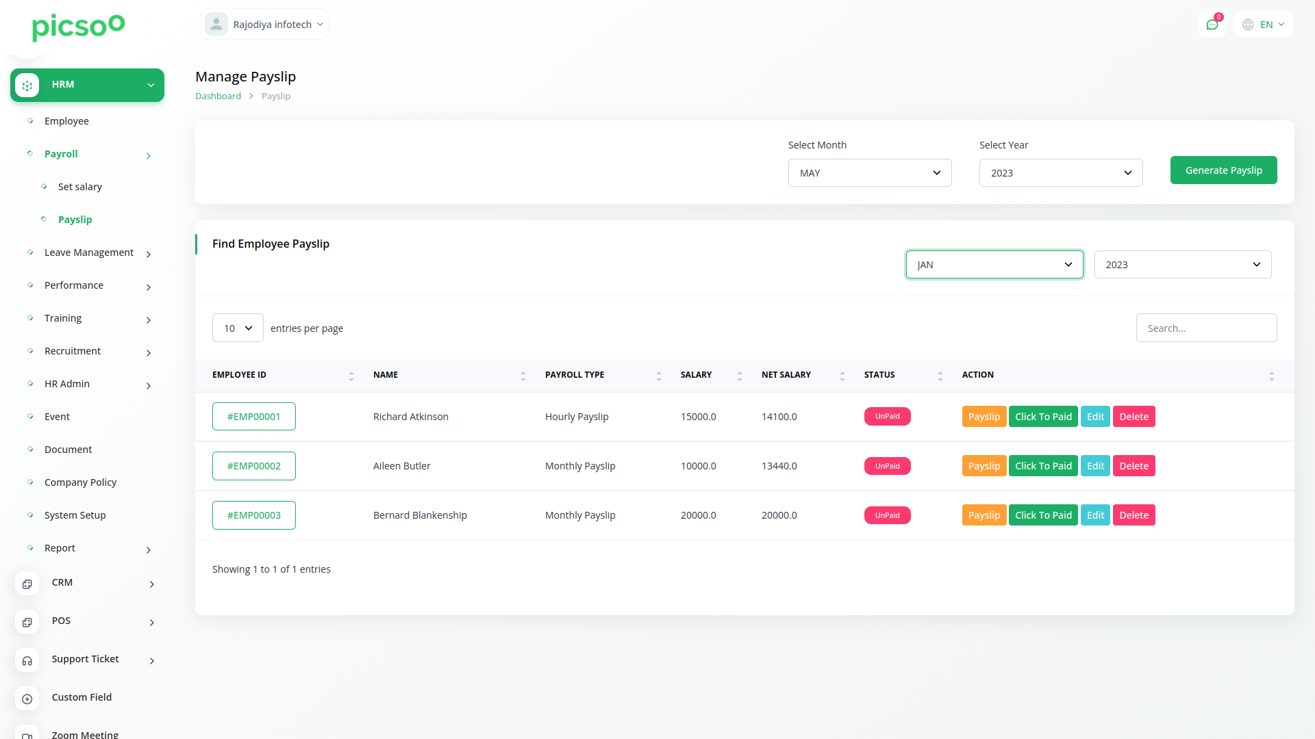 You can generate monthly payslips and make bulk payments through easy clicks. You could also change the status of the payslip with an easy CTA. An employee could view the breakdown of their salary components.