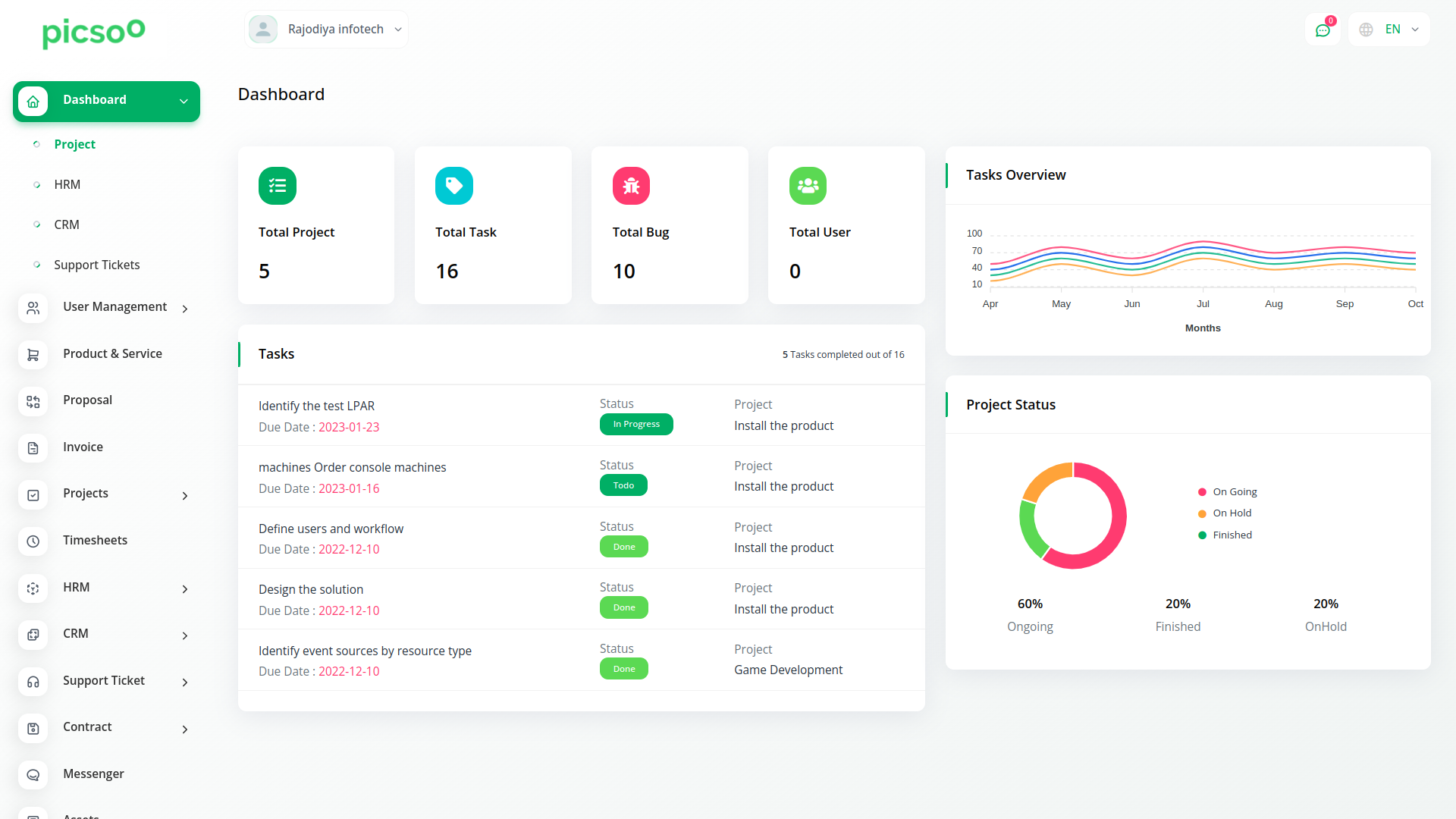 Obtenez une vue d'ensemble du nombre total de projets, de tâches, de bogues et de membres. Une représentation visuelle de l'aperçu des tâches et de l'état du projet peut vous aider à évaluer l'avancement de chaque tâche. Enfin, vous pouvez vérifier la tâche la plus échue.